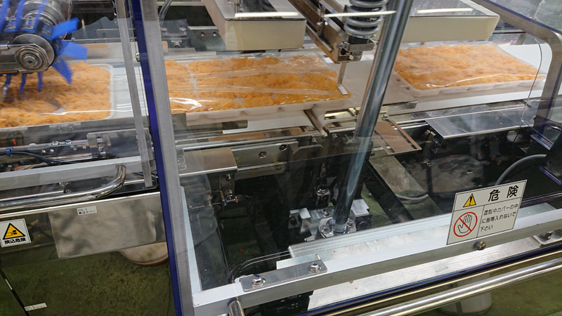 これが、件のピロー包装機の全景になります。左手よりフライが流れてきて、機械の中を通過していく間に袋詰めされてしまうという恐るべきメカニズム。
